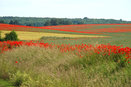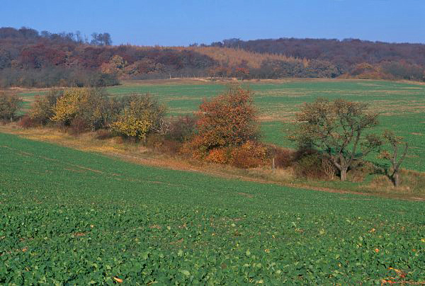 The Nördliche Harzvorland is a region characterized by rolling hills, vast crop fields, low mountain ranges, and lowlands created by rivers. Due to its favorable climate, the region is dominated by agriculture. Apart from the traditional seed breeding industry, the fertile loess soil is used for wine, fruit and extensive grain and root crop growing. The Grosse Bruch, a narrow and low strip of land stretching along the former intra-German border, its meadows featuring ditches lined with reed and willows, merges into the Börde landscape toward the North. In due distance from the Harz mountains are the north-south-orientated small ranges of the Fallstein, Huy and Hakel hills. Millions of years ago, these terrains were pushed upwards by the pressure induced by the formation of the Harz mountains; their dry limestone provides fertile soil for a vegetation of partially ancient beech forests. The Huy hills are characterized by a unique phenomenon: the so-called “glacier pots” (Gletschertöpfe), rock formations caused during the Ice Age by melt water erosion. The Teufelsmauer, a long stretch of jagged sandstone formations, is a wild potpourri of bizarre rocks and groves of birches, oaks and mountain ashes, a landscape reminiscent of the neighboring Harz mountains. The regions main cities are Halberstadt and Osterwieck.