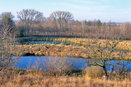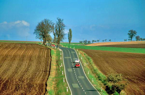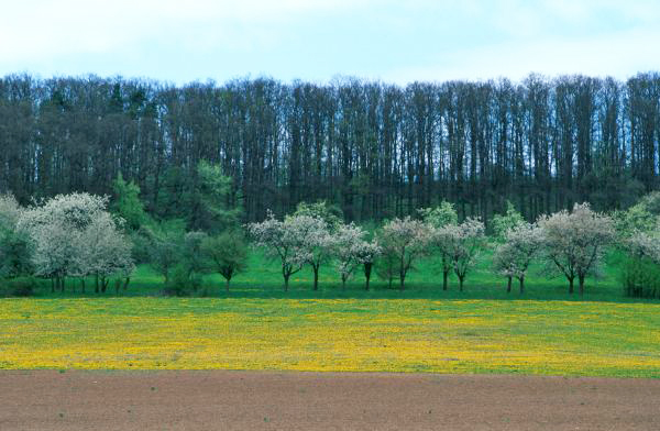 In the center of Thuringia, surrounded by the Thüringer Wald, Thüringer Schiefergebirge, Kyffhäuser and Finne mountains and the Eichsfeld region, lies the Thuringian basin (Thüringer Becken), a flat, open landscape with small lakes and streams. The biggest river in this fertile landscape is the Unstrut river. Forested heights give visitors a taste of the nearby Thüringer Wald and other low mountain ranges. The Thuringian basin is divided into two distinct subregions: on the one hand, the central, flat part, which features only few uplands such as the Fahner Höhe, the Ettersberg, and the Tannrodaer Gewölbe; on the other hand, the peripheral regions featuring the Hainleite, Ohmgebirge, Dün and Hainich mountains along the Northwestern edge, as well as the Jenaer Zeugenberge and shell limestone mountains along the Saale river. The landscape of the Thuringian basin was formed mainly in the Triassic period, featuring shell limestone, variegated sandstone and Keuper characteristics. The gently undulating floodplains with their wide river courses in the center of the Thuringian basin gradually give way to the hilly area around its edge. The region is used for intensive crop growing and is thus dominated by vast fields. Excellent soil conditions have made this possible in spite of a low level of precipitation; however, the soil shows evidence of severe erosion, mainly by wind forces. Apart from fruits and vegetables, woad was the crop of choice until the 17th century, a plant used for making blue dye.