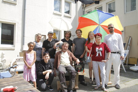 vorn, v.l.n.r.: Lou Petersohn (Komparsin), Lisa Emele (Produktionskoordination), Thorsten Merten (Hauptrolle André)
