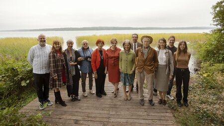 Am Set (v.l.n.r.): Hooman Afshari (Co-CEO STUDIOCANAL Germany), Nina Lilith Völsch, Jenny Erpenbeck (Autorin der Buchvorlage), Volker Schlöndorff (Regisseur), Regina Ziegler (Produzentin Ziegler Film), Martina Gedeck, Angela Winkler, Michael Maertens, Wigand Witting, Vera Weisbrod, Lutz Rippe (Co-CEO STUDIOCANAL Germany), Melina Hiller (Acquisitions STUDIOCANAL)